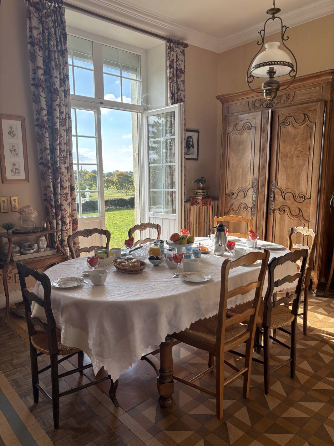 Une jolie chambre très claire avec salon. Une porte-fenêtre donne accès au jardin d’agrément et au parc